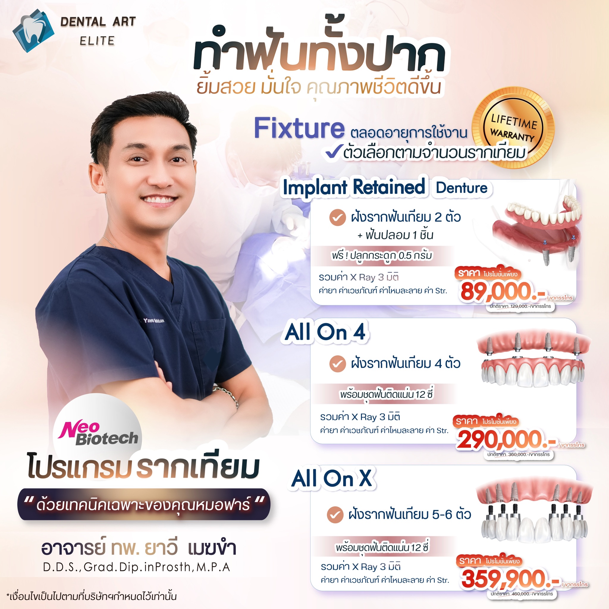เด็นทัล อาร์ต เอลีท ผู้นำด้านการรักษาที่มีความทันสมัย มุ่งเน้นการรักษาแบบครบวงจร อุดฟัน ขูดหินปูน ถอนฟัน รักษารากฟัน และงานเฉพาะทางทุกสาขา ตอบโจทย์ทุกศาสตร์รอยยิ้มที่สวยงามอย่างเป็นธรรมชาติให้กับทุกกลุ่ม ทุกช่วงวัย เพื่อให้คุณเป็นเจ้าของรอยยิ้มที่สวยงามในแบบฉบับของคุณเอง เรามุ่งเน้นประสิทธิภาพการรักษาจากการดูแลอย่างใกล้ชิดโดยทีมทันตแพทย์ผู้มากประสบการณ์เฉพาะด้าน และผสมผสานกับเทคโนโลยีการรักษาที่ทันสมัยโดยใช้ระบบดิจิตอลให้มากที่สุด ในส่วนงานรากฟันเทียมทุกเคสจะควบคุมการรักษาและแผนการรักษาโดย อ.ทพ.ยาวี เมฆขำ อย่างเป็นแบบแผนเดียวกัน เพื่อผลการรักษาที่ดีที่สุด