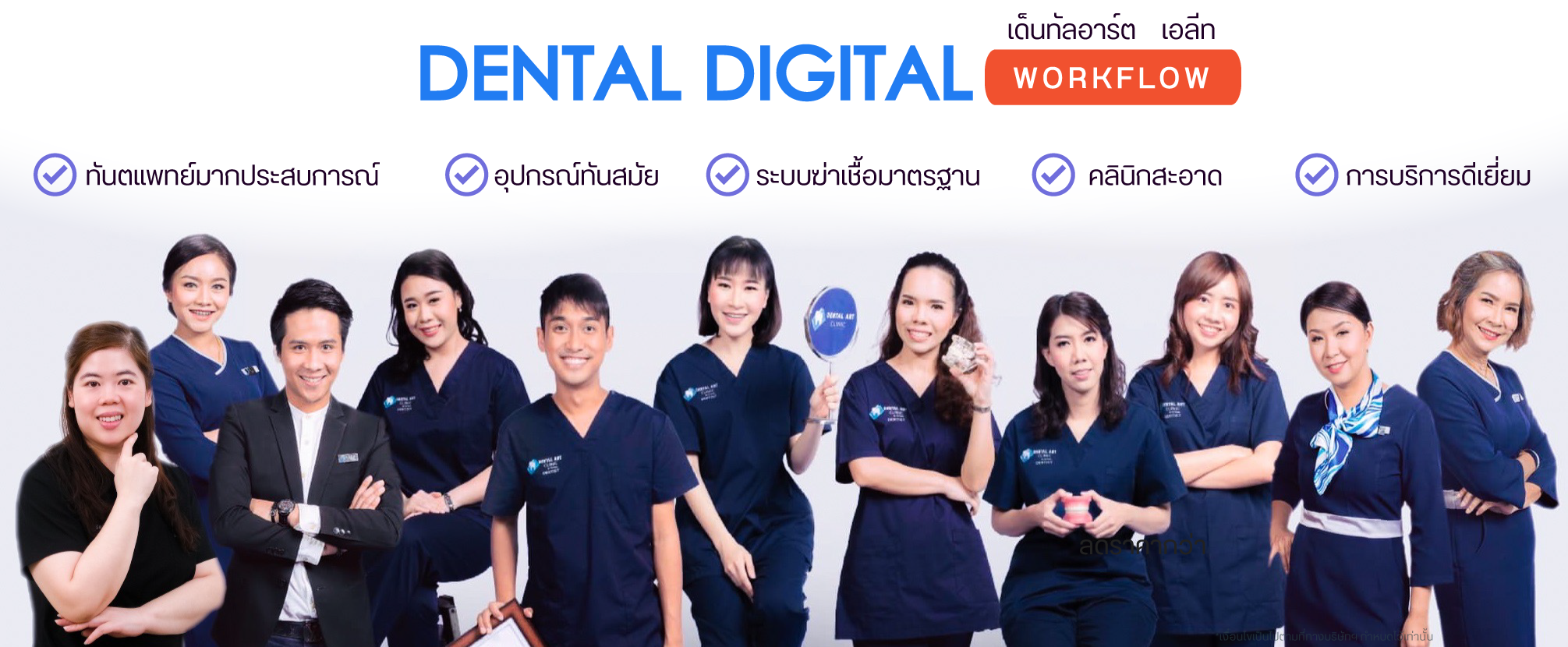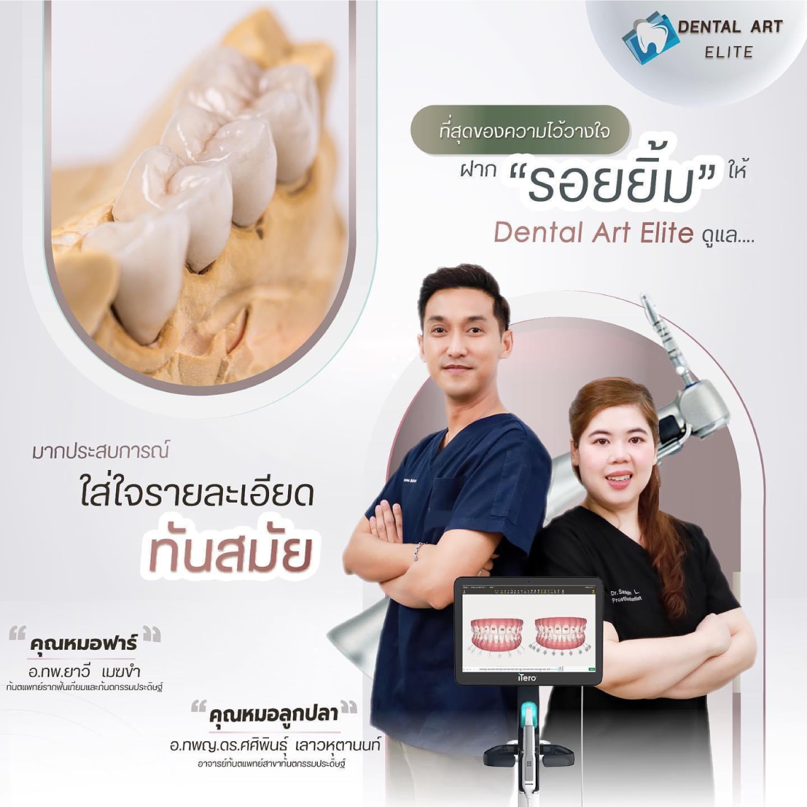 เด็นทัล อาร์ต เอลีท ผู้นำด้านการรักษาที่มีความทันสมัย มุ่งเน้นการรักษาแบบครบวงจร อุดฟัน ขูดหินปูน ถอนฟัน รักษารากฟัน และงานเฉพาะทางทุกสาขา ตอบโจทย์ทุกศาสตร์รอยยิ้มที่สวยงามอย่างเป็นธรรมชาติให้กับทุกกลุ่ม ทุกช่วงวัย เพื่อให้คุณเป็นเจ้าของรอยยิ้มที่สวยงามในแบบฉบับของคุณเอง เรามุ่งเน้นประสิทธิภาพการรักษาจากการดูแลอย่างใกล้ชิดโดยทีมทันตแพทย์ผู้มากประสบการณ์เฉพาะด้าน และผสมผสานกับเทคโนโลยีการรักษาที่ทันสมัยโดยใช้ระบบดิจิตอลให้มากที่สุด