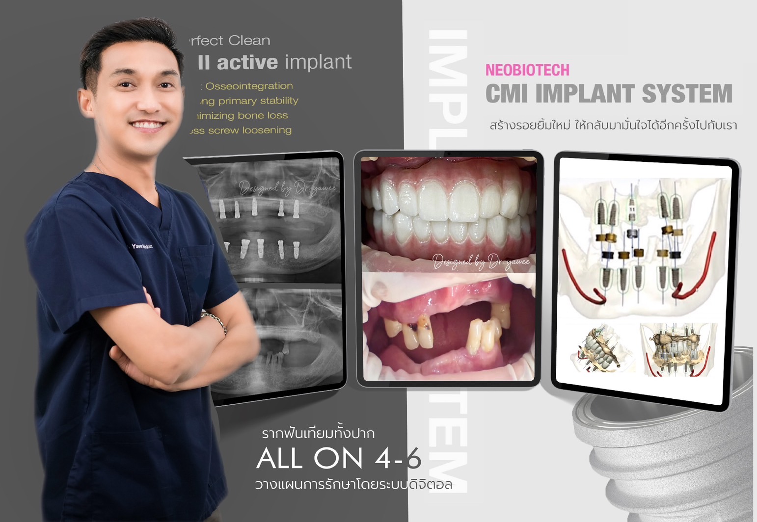 ทางเลือกที่ 3 รากฟันเทียมทั้งปาก All On 4-6 การทำรากฟันเทียมติดแน่นทั้งปาก แบบ All on 4-6 เป็นหนึ่งในเทคนิคที่เรียกตามจำนวนการใช้รากเทียมที่ฝังลงไปต่อ 1 ขากรรไกร อาจจะใช้ 4 ราก 5 ราก หรือ 6 ราก ขึ้นอยู่กับปัจจัยของมวลกระดูก แรงที่ใช้กัด ระบบไซนัสเส้นประสาท เพื่อเชื่อมกับชุดฟันแบบติดแน่นด้านบนรากฟันเทียม โดยเป็นเทคนิคที่ทันสมัย มีประสิทธิภาพมาก และประหยัดค่าใช้จ่ายมากที่สุด วิธีนี้จะคำนวณเฉพาะรากเทียมที่ต้องใช้จริงและจำเป็นเท่านั้น เพื่อให้รับแรงได้เพียงพอและมีอายุการใช้งานในระยะยาวที่นาน