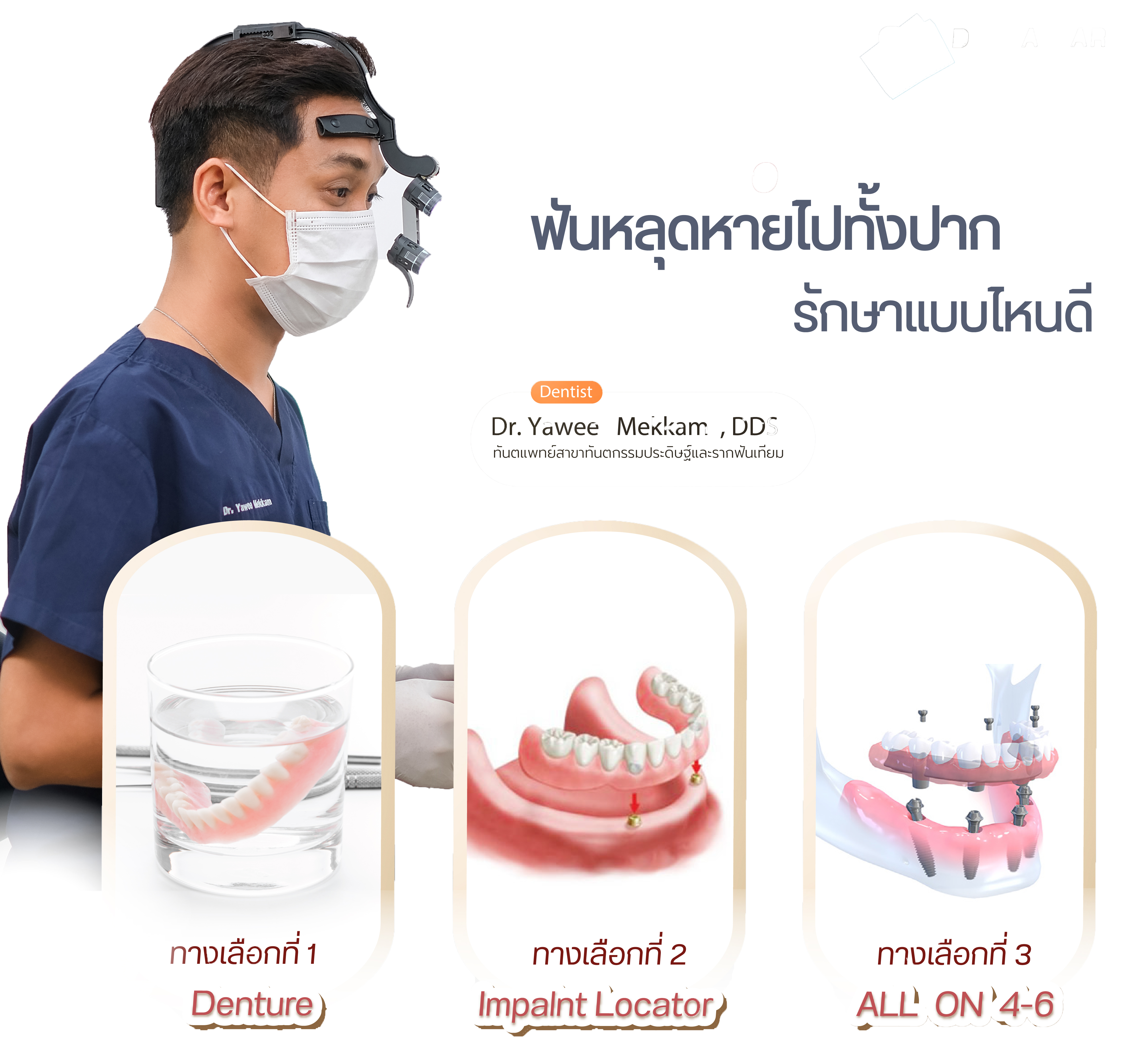 ทางเลือกที่ 2 ฟันปลอมกึ่งติดแน่น Implant Locator รากฟันเทียมร่วมกับฟันปลอมถอดได้ทั้งปาก โดยจะใช้รากฟันเทียม 2 หรือ 4 ตัวต่อขากรรไกรเพื่อช่วยยึดให้ฟันปลอมแน่น ทำให้พูด เคี้ยวอาหารและยิ้มได้อย่างมั่นใจ ลดการละลายตัวของสันเหงือกที่ถูกกดทับโดยฟันปลอมแบบถอดได้