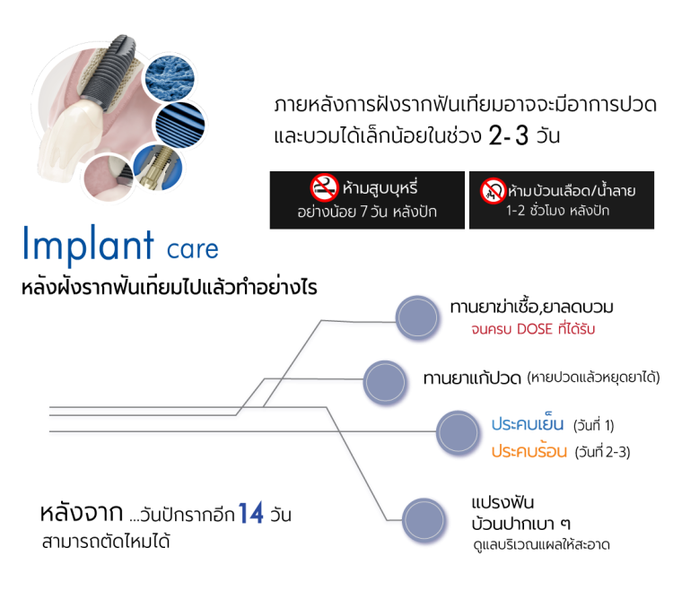 ขั้นตอนการปักรากฟันเทียมจะใช้ระยะเวลาประมาณ 1 - 2 ชั่วโมง คุณลูกค้าจะรู้สึกเจ็บแค่ตอนฉีดยาชาค่ะ หลังจากนั้นพอยาชาออกฤทธิ์ คุณหมอถึงจะเริ่มทำการปักรากฟันเทียมค่ะไม่น่ากลัวนะคะ เนื่องจากปัจจุบันวิวัฒนาการทางการแพทย์ดีมากค่ะ และคลินิกเราใช้ระบบ X Ray 3 มิติในการวางแผน คุณหมอจะกรีดแผลเล็ก ๆ และฝังรากฟันเทียมลงไป หลังจากนั้นจะทำการเย็บปิดแผลอย่างสวยงามค่ะ ไม่มีเลือดไหลนะคะ อาจจะมีซึม ๆ บ้างในช่วง 1 ชั่วโมงแรก หลังจากนั้นเลือดจะหยุดเลยค่ะหลังทำเสร็จอาจจะมีอาการบวม และตึง ๆ บริเวณแผลเล็กน้อย เพียง 1-3 วัน